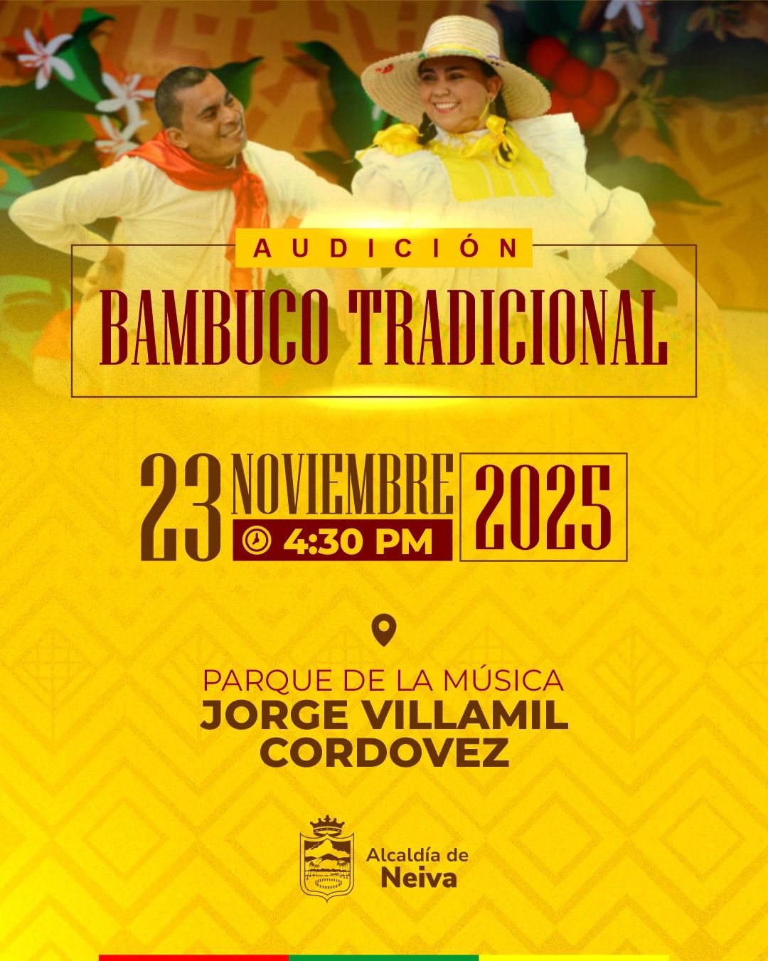 La Alcaldía de Neiva, a través de la Secretaría de Cultura y el comité organizador del Festival del Bambuco, abrió las convocatorias para artistas, grupos y agrupaciones interesadas en participar en la 65.ª edición del Festival del Bambuco en San Juan y San Pedro, que se realizará a mediados del año 2026.
