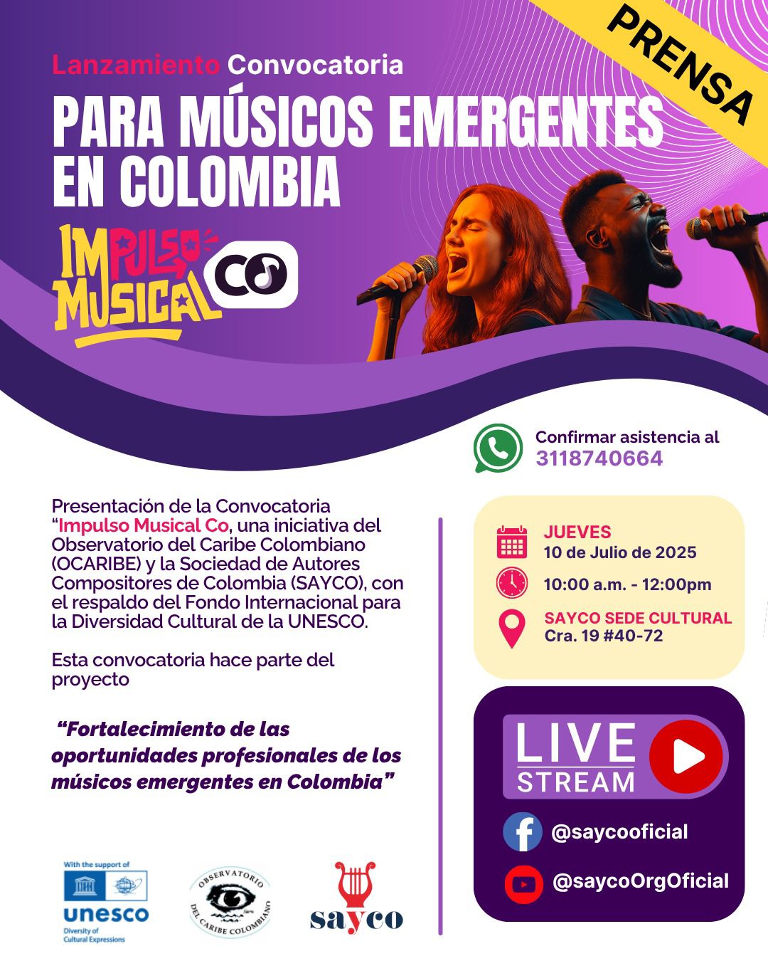El evento de lanzamiento se llevará a cabo este jueves 10 de julio de 2025, de 10:00 a. m. a 12:00 m., en la Sede Cultural de SAYCO, Carrera 19 #40-72 y contará con transmisión en vivo a través de los canales digitales YouTube y Facebook de SAYCO y el sitio web oficial: www.impulsomusical.co