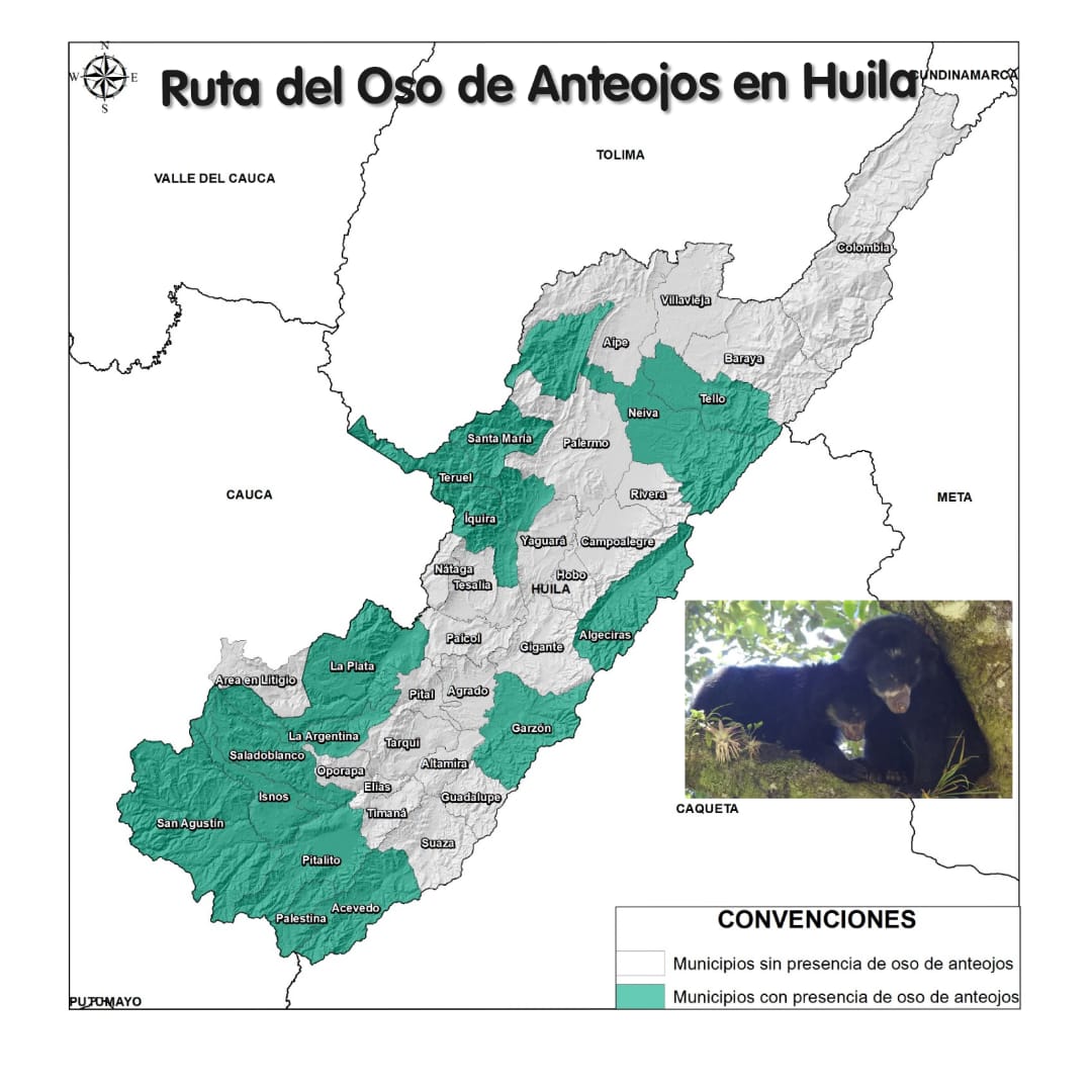 El oso de anteojos habita en 15 municipios del Huila, entre ellos Acevedo, Algeciras, Garzón, Íquira, Isnos, La Argentina, La Plata, Neiva, Palestina, Pitalito, Saladoblanco, San Agustín, Santa María, Teruel y Tello.