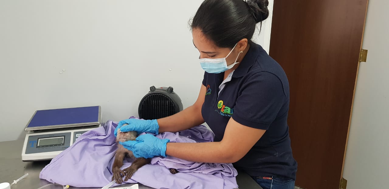 El mono cariblanco, que fue entregado por la Policía de Carreteras, producto de un decomiso, llegó gravemente afectado, con una desnutrición severa, sus colmillos habían sido retirados, recientemente, por lo que presentaba afectaciones en sus encías, entre otros problemas de salud.