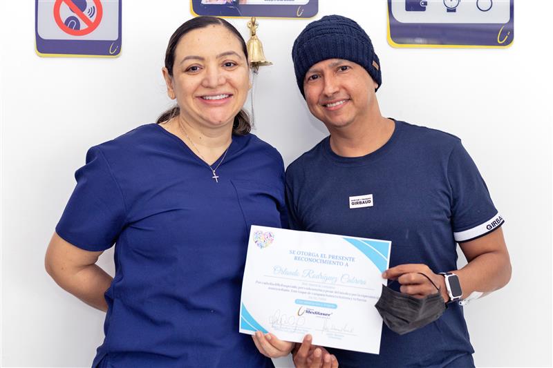El protagonista de este momento fue Orlando Rodríguez Cabrera, paciente diagnosticado con linfoma de Burkitt, uno de los cánceres más agresivos del sistema sanguíneo. Tras cerca de ocho meses de lucha, seis de ellos bajo la atención especializada de Clínica Medilaser, Orlando tocó la campana como símbolo de vida, fortaleza y superación.