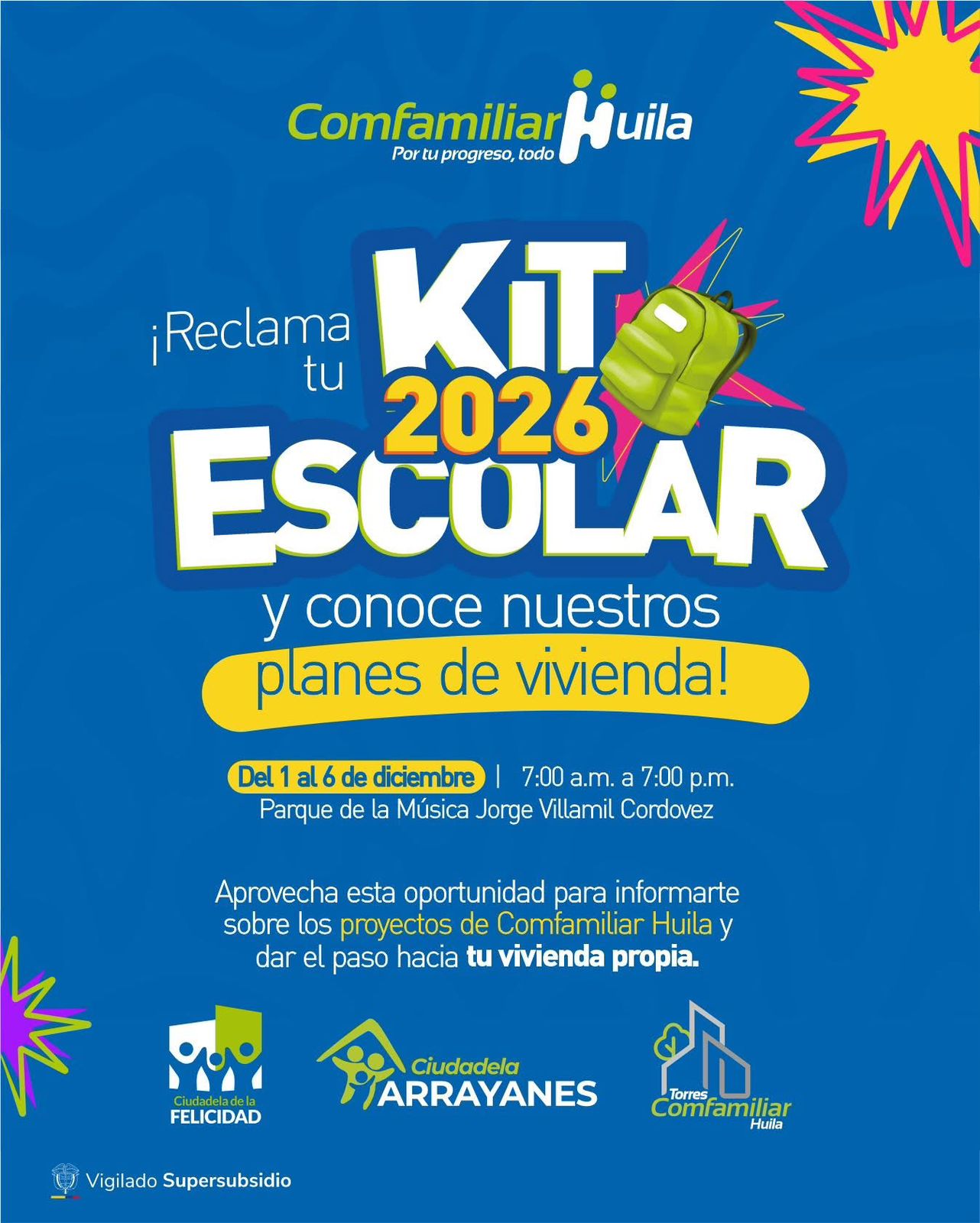 Comfamiliar Huila inició la entrega del Kit Escolar 2026, un apoyo fundamental para miles de familias afiliadas que se preparan para el nuevo año académico. Los kits estarán disponibles en las agencias de Pitalito, Garzón, La Plata y Neiva, desde las 7:00 a.m. hasta las 7:00 p.m. en jornada continua.