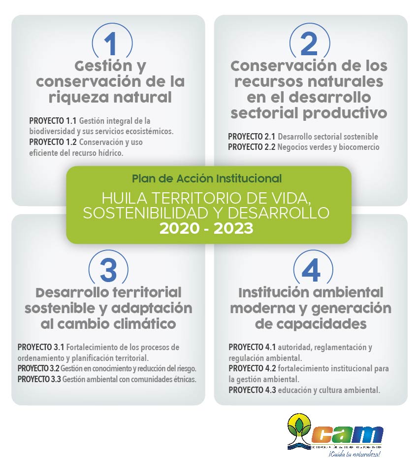 El Plan de Acción de la CAM está articulado no solo con los objetivos de desarrollo sostenible, sino también con las metas de desarrollo del milenio, con el Plan de Desarrollo Nacional ‘“Pacto Por Colombia, Pacto por la Equidad”, el Plan de Desarrollo Departamental ‘Huila Crece’, con el Plan de Gestión Ambiental Regional -PGAR y con la Visión ‘Huila 2050’, para enfrentar y adaptarnos al cambio climático.