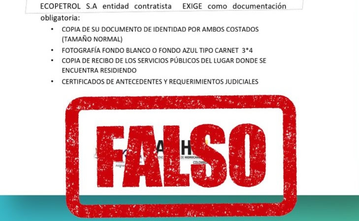 Ecopetrol informa a la opinión pública que, ante denuncias que se han venido presentando en el departamento del Huila, se han identificado casos de personas inescrupulosas que están utilizando de manera indebida el nombre y los logos de la compañía, la Agencia Nacional de Hidrocarburos (ANH) y el Ministerio de Minas y Energía, con el fin de engañar a la ciudadanía a través de falsas convocatorias laborales.