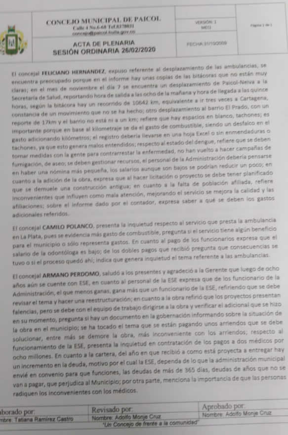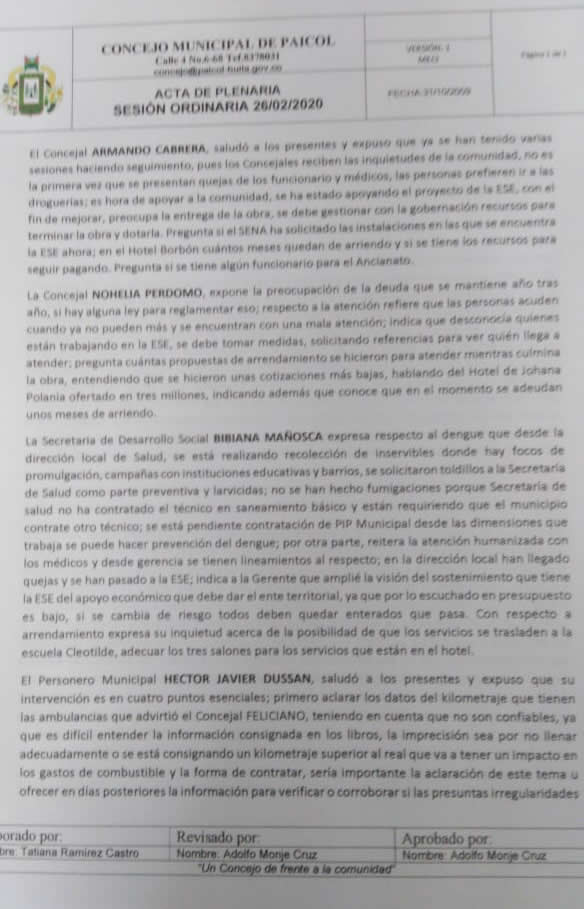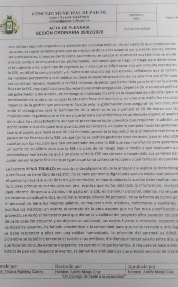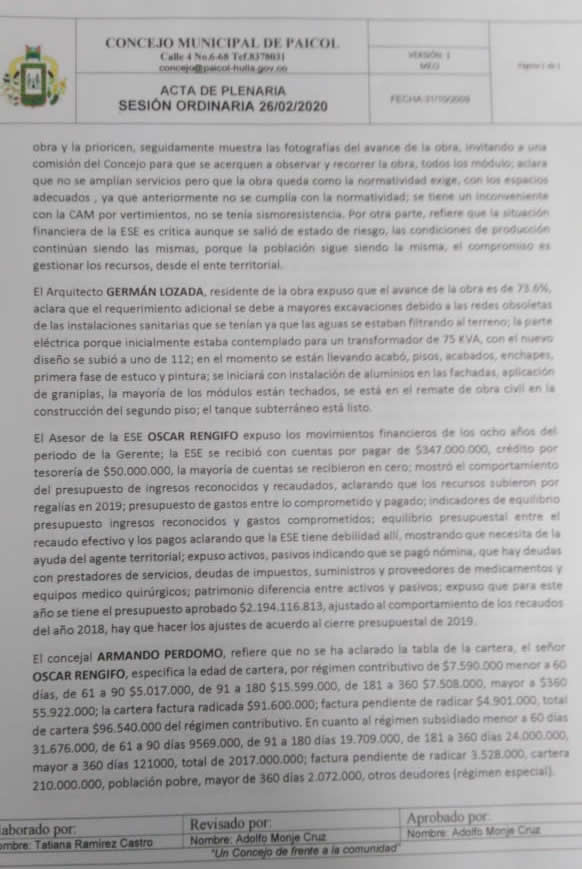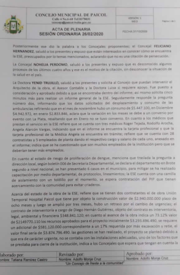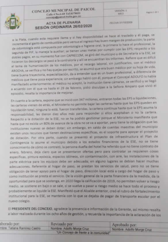 El debate fue realizado el pasado 26 de febrero donde se mostraron las pruebas de sobrecostos en combustible, recorridos en vehículos oficiales en distancias superiores a 1000 kilómetros sin justificación, y exagerados gastos en suministros, donde además queda claro que, debido a la deficiente gestión, la ESE de Paicol está en riesgo, como lo confirma la Supersalud y lo califica el Ministerio de Salud.