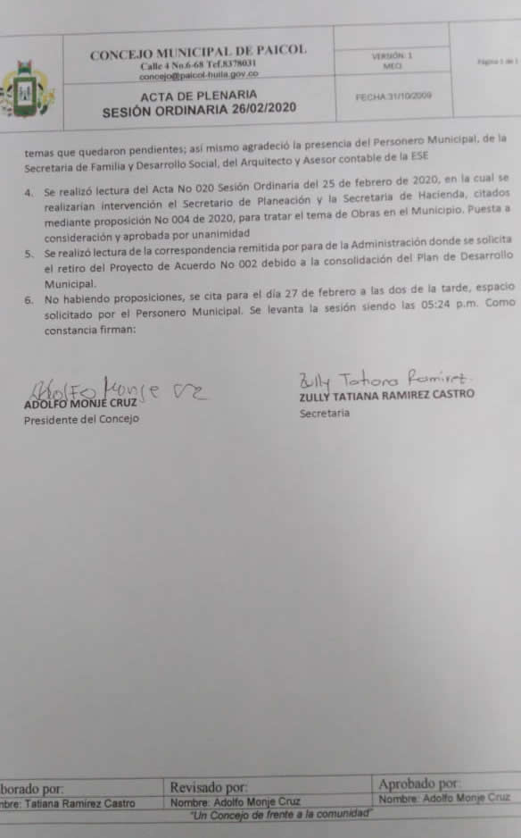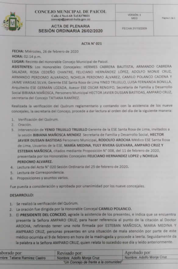 Facsímil del acta de Plenaria del Concejo No. 021