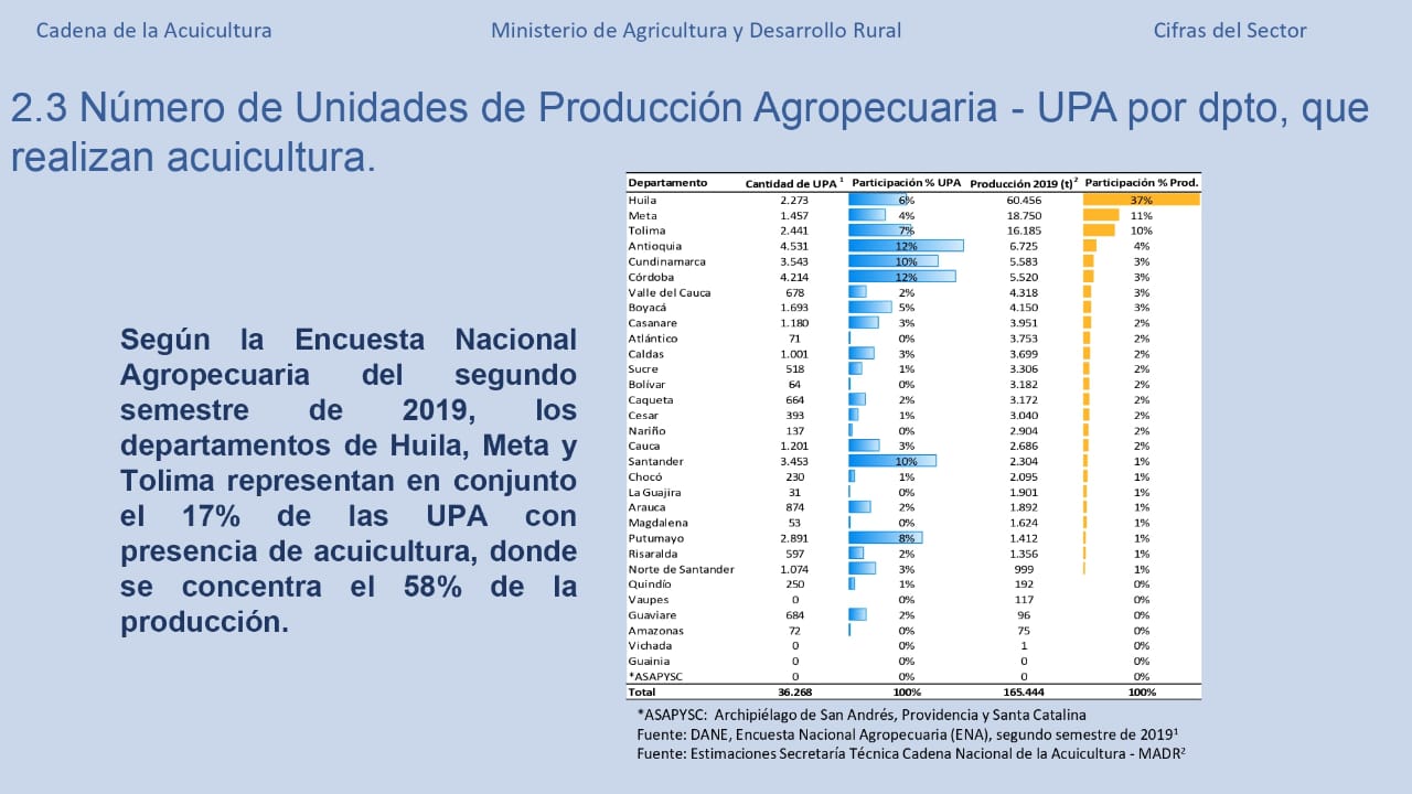 En establecimiento de Unidades de Producción Agropecuaria los departamentos de Huila con 2.273, Meta con 1.457 y Tolima con 2.441, representan en conjunto el 17% de las UPA con presencia de acuicultura, donde se concentra el 58% de la producción nacional, esto es muy importante debido a la oferta de puestos de trabajo en torno a dichas unidades. En 2021 se generaron a nivel nacional 57.756 Empleos directos y 173.269 Empleos indirectos.