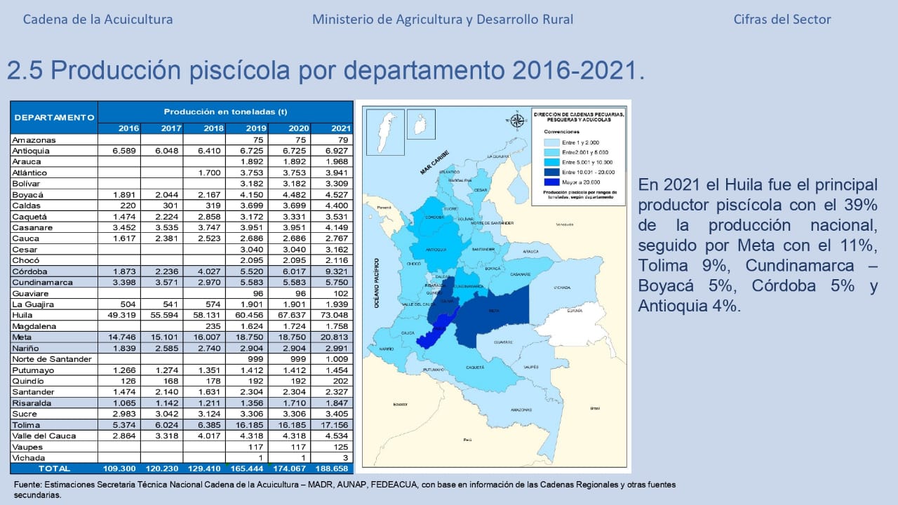De acuerdo a las cifras reveladas en la Evaluación Agropecuaria 2021, el país pasó de producir 174.067 toneladas a 188.658 toneladas de pescado, donde el Huila hizo un aporte 73.048 toneladas principalmente en mojarra roja y plateada, que corresponde al 39% de la producción piscícola nacional, seguido por el Meta con 11%, Tolima con 9%, Córdoba, con 5%, Cundinamarca y Boyacá con el 5%, y Antioquia con el 4%.