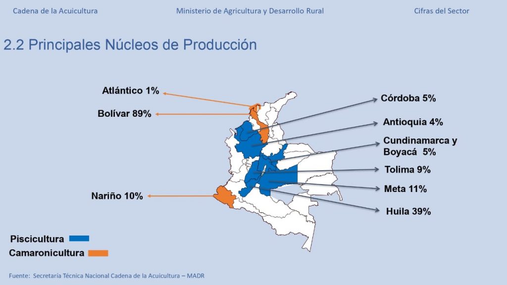 De acuerdo a las cifras reveladas por el Ministerio de Agricultura y Desarrollo Rural, el departamento del Huila aporta el 39% de la producción piscícola nacional, y se mantiene con un 85% en volúmenes de exportación principalmente de tilapia.