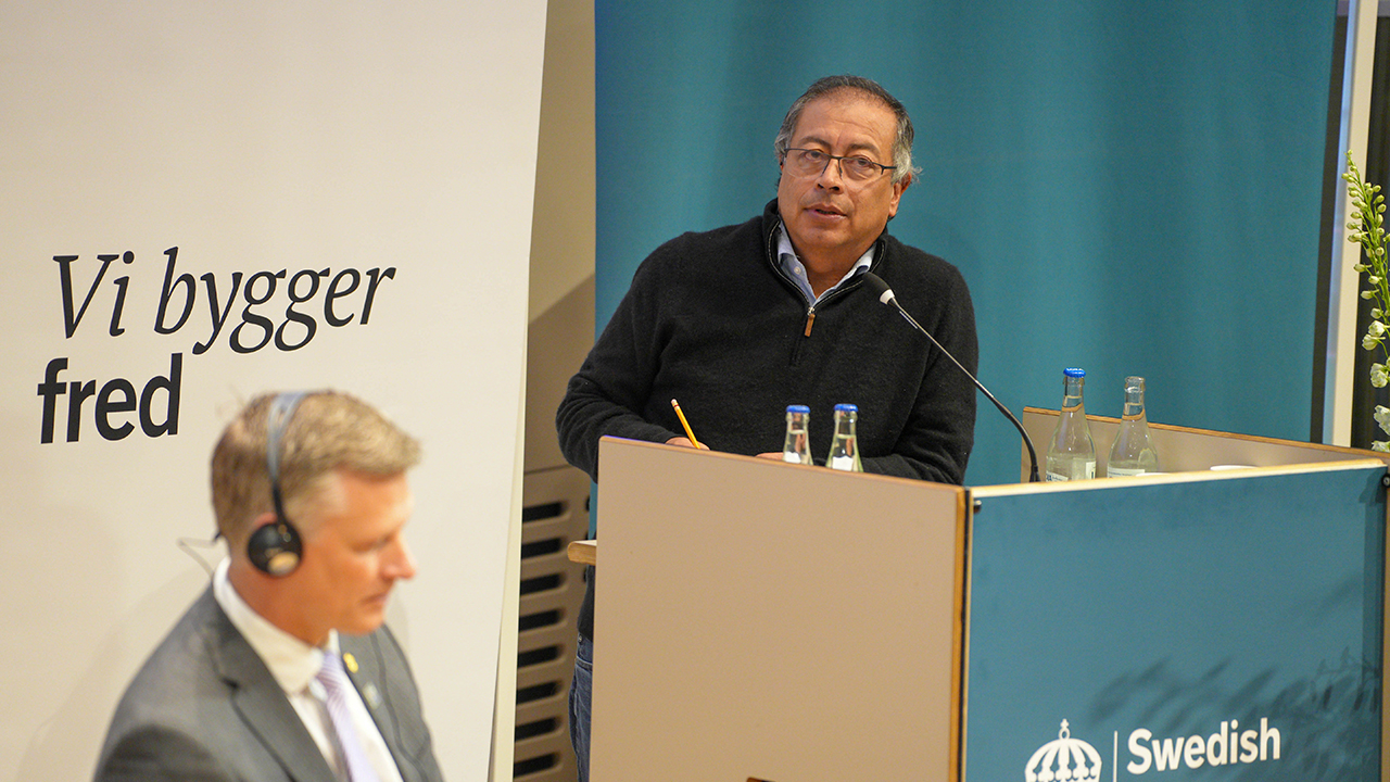 En su intervención en el foro ‘Transformando vidas, Seguridad Humana y Paz Total en Colombia’, en el auditorio de la Universidad Sueca de Defensa, el jefe de Estado manifestó que “la posibilidad de pasar a una era de paz, como la mayoría de las naciones del mundo, si está a la vuelta de la esquina, pero implica una transformación de Colombia”.