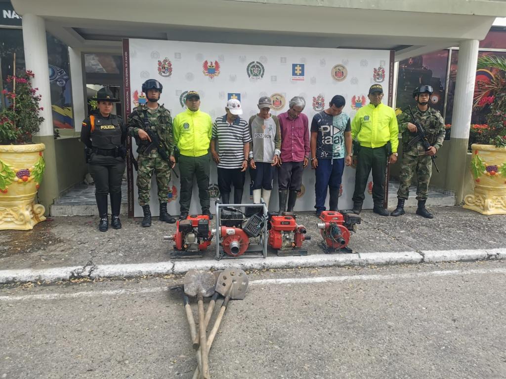 Las cuatro personas capturadas en flagrancia por explotación ilícita de yacimiento minero, daño a los recursos naturales, contaminación ambiental por explotación ilícita de yacimiento minero y afectación de fuente hídrica, fueron dejadas a disposición de la autoridd competente.