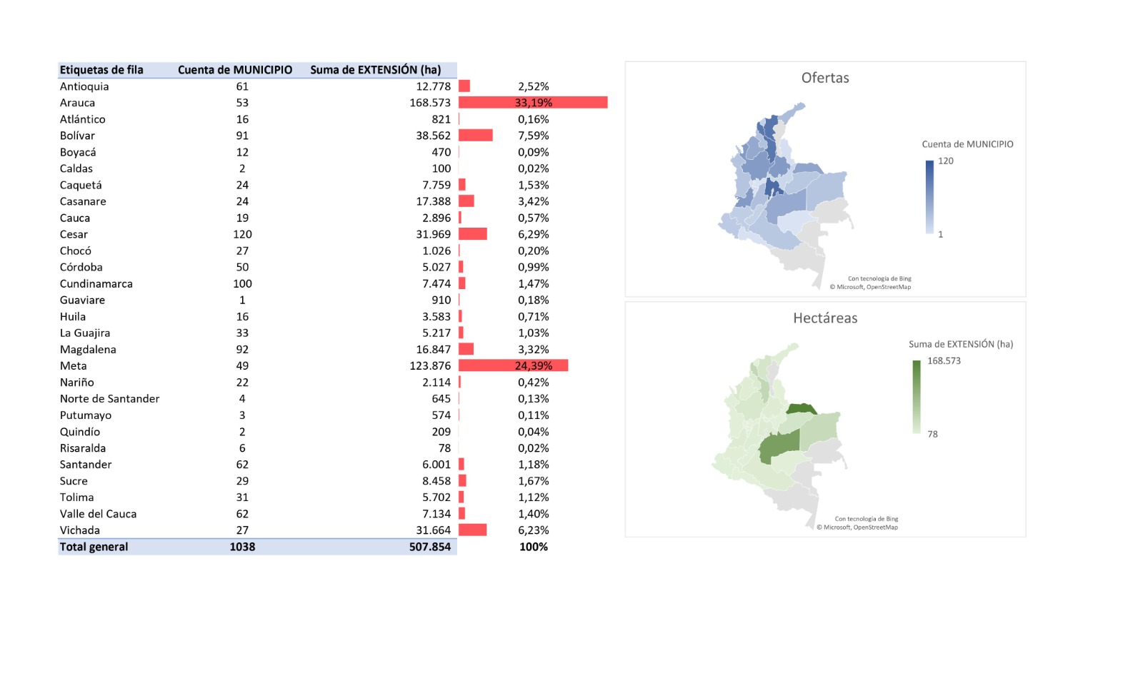 – De acuerdo con la información de FEDEGÁN, el mayor volumen de ofertas se concentra en 10 departamentos del territorio colombiano que reúnen el 90 por ciento del total de las ofertas del país.