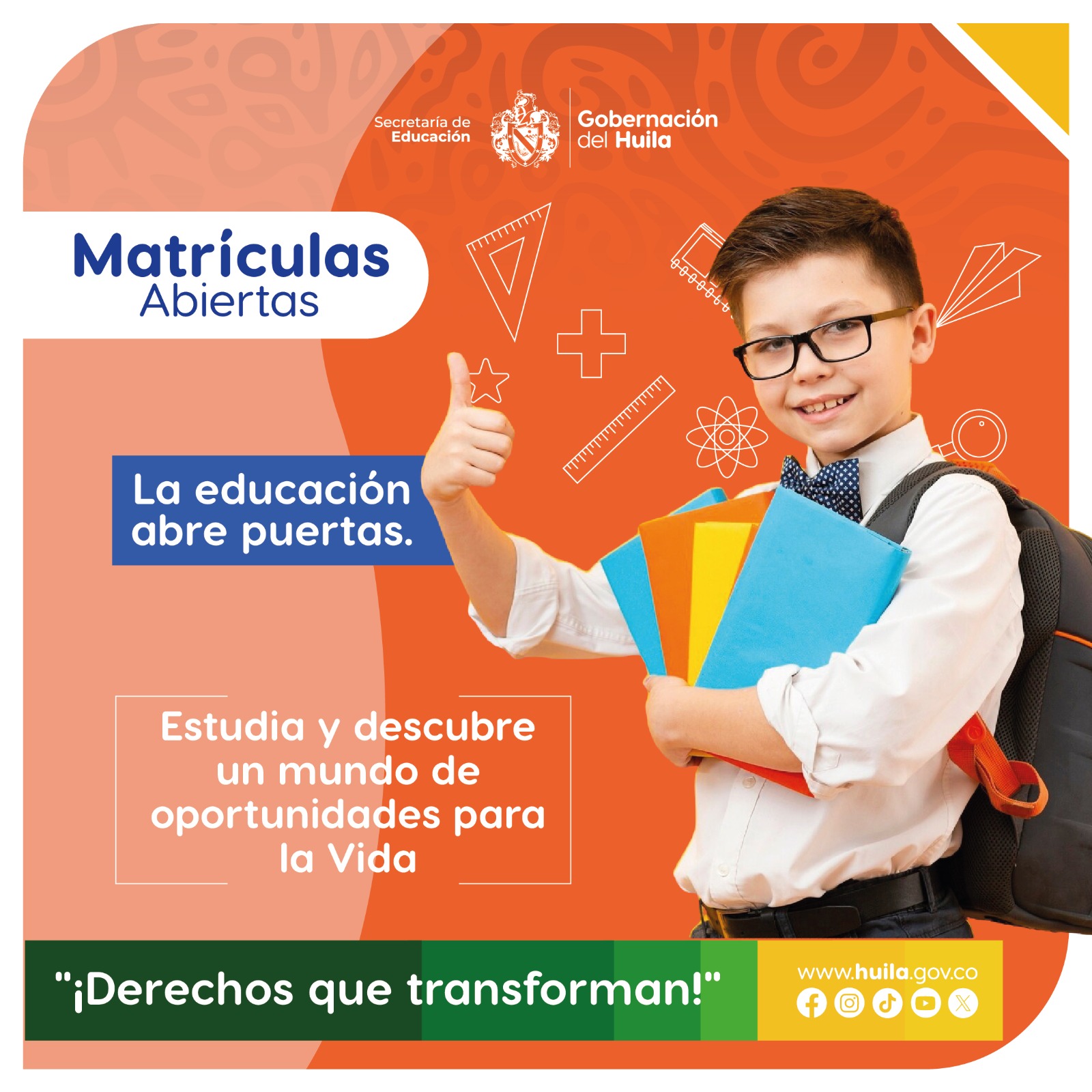 «Venimos cumpliendo con esta importante convocatoria de cobertura educativa en todos los municipios del Huila. Pero aún falta y juntos podemos alcanzar la meta. Recordarles que la educación, además de ser un derecho de nuestros niños y niñas, es asegurarles un futuro para la formación de mejores seres humanos con muchas oportunidades en la vida», complementó el secretario.