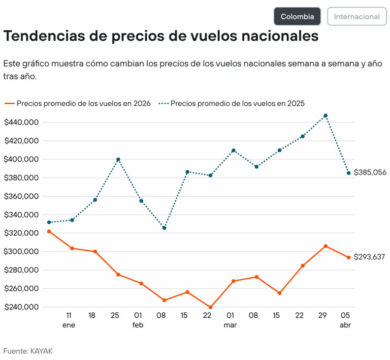 • Tendencias semanales de precios de vuelos: una visión completa de cómo evolucionan semana a semana los precios promedio de los vuelos para viajes desde Colombia a destinos nacionales e internacionales.