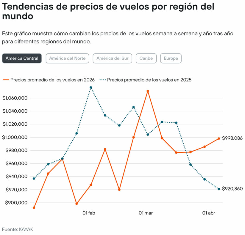 A partir de datos de búsqueda de KAYAK y actualizaciones semanales todos los martes, la herramienta ofrece a los viajeros una visión clara de cómo factores como la estacionalidad, el costo del combustible y tendencias macroeconómicas pueden impactar en las tarifas aéreas, para que puedan planificar y reservar con más confianza.