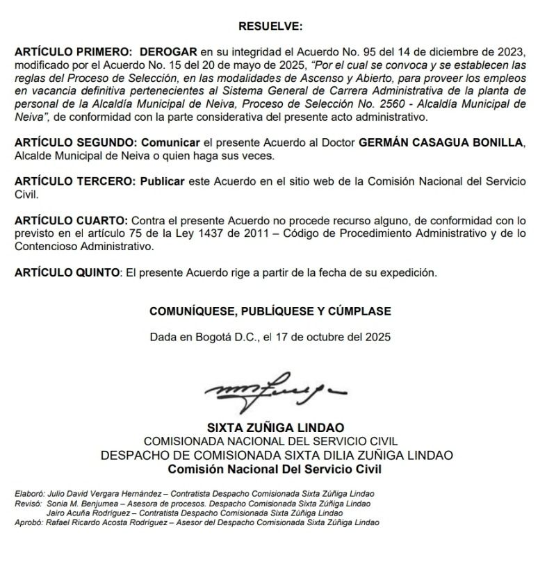 La Comisión Nacional del Servicio Civil (CNSC), le dio un duro golpe a la herencia administrativa del exalcalde Gorky Muñoz Calderón, al derogar el concurso de méritos número 2560, convocado en diciembre de 2023 para proveer más de doscientos cargos en la Alcaldía de Neiva.