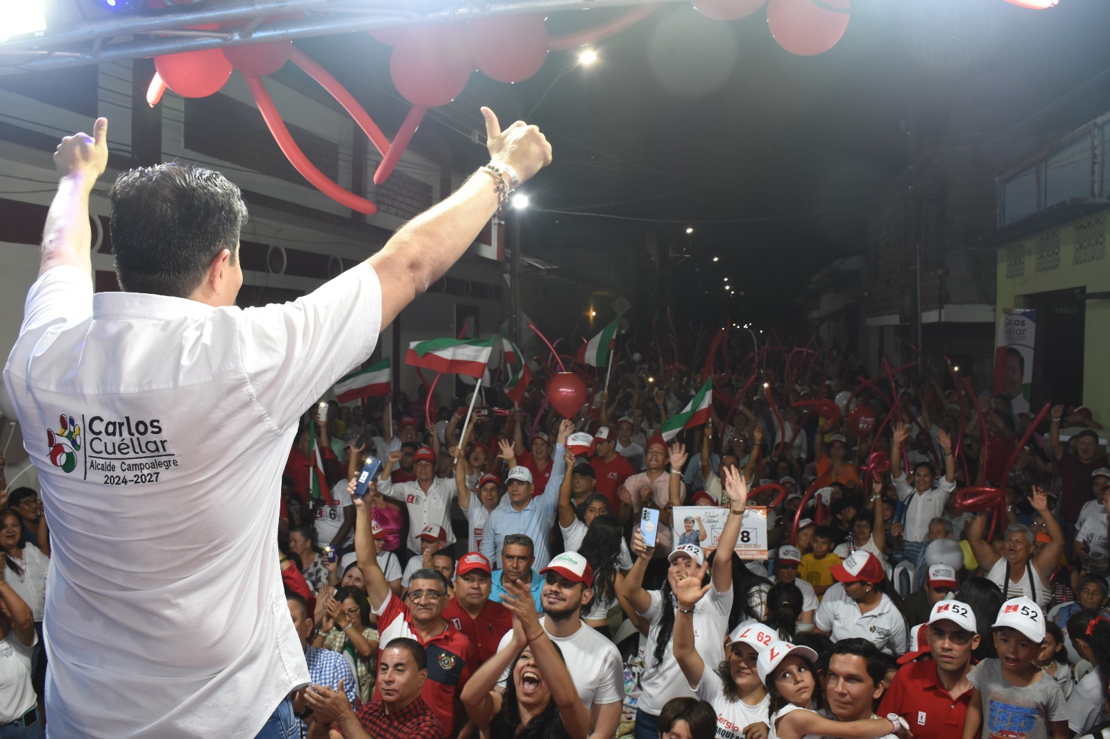 Más de 3.000 personas asistieron al evento que resultó todo un éxito. Carlos Cuéllar se ha venido ganando el corazón y el cariño del pueblo campoalegruno y esto se demostró en su cierre de campaña, pues masivamente sus paisanos decidieron acompañarlo y manifestarle su total respaldo.