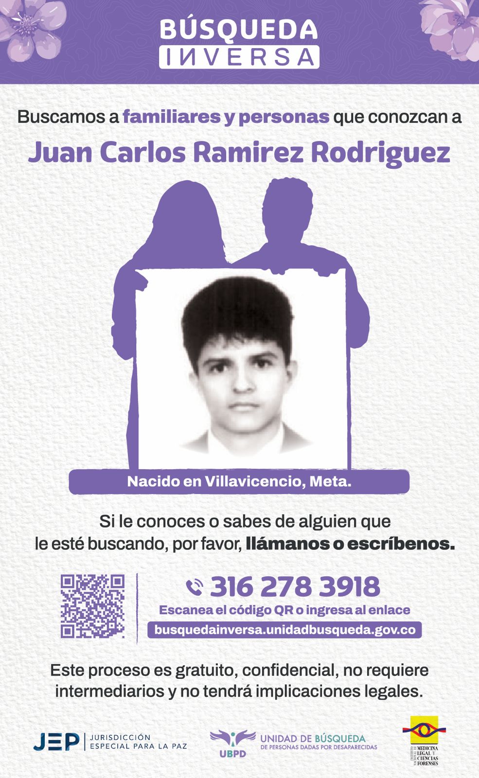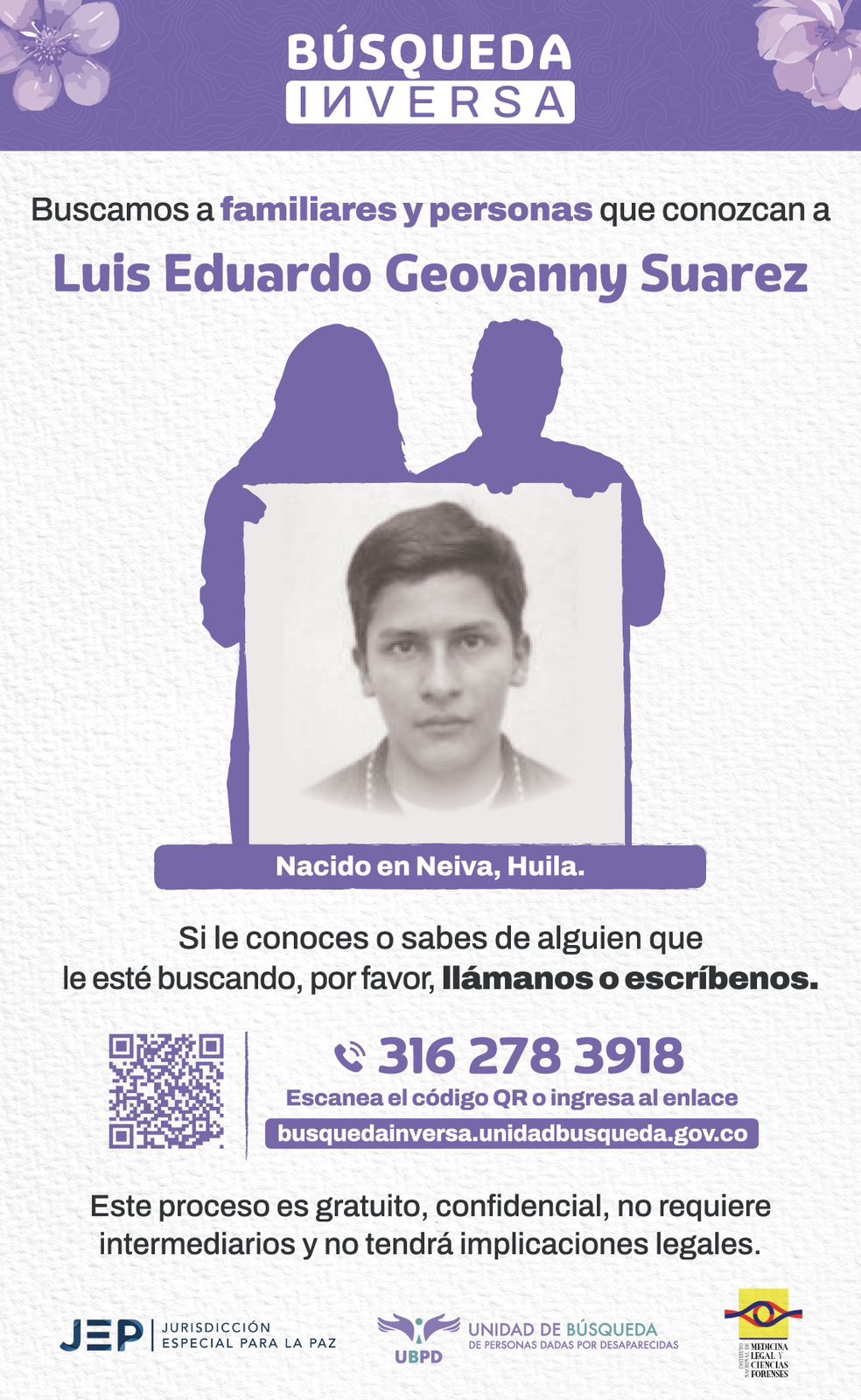 Luis Eduardo Geovanny Suárez y Juan Carlos Ramírez Rodríguez, son dos personas desaparecidas en medio de acciones del conflicto armado, que fueron plenamente identificadas en algún momento, sin embargo, por diferentes motivos no fue posible entregarlos a sus seres queridos y hoy forman parte de la estrategia Búsqueda Inversa, una metodología con la que la Unidad de Búsqueda de Personas dadas por Desaparecidas (UBPD), la Jurisdicción Especial para la Paz (JEP) y el Instituto Nacional de Medicina Legal y Ciencias Forenses ayudan a las personas desaparecidas a encontrar a sus familias.