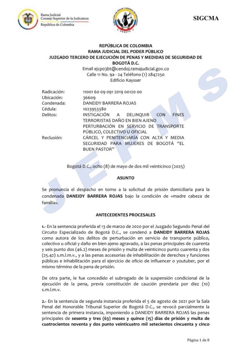 Barrera Rojas fue condenada por los delitos de instigación a delinquir con fines terroristas, daño en bien ajeno y perturbación del servicio de transporte público, tras los actos vandálicos registrados en Bogotá. Además de la pena de 63 meses y 15 días de prisión, se le impuso una multa superior a los 492 millones de pesos y la inhabilitación para ejercer como influencer o youtuber durante el tiempo de la pena.