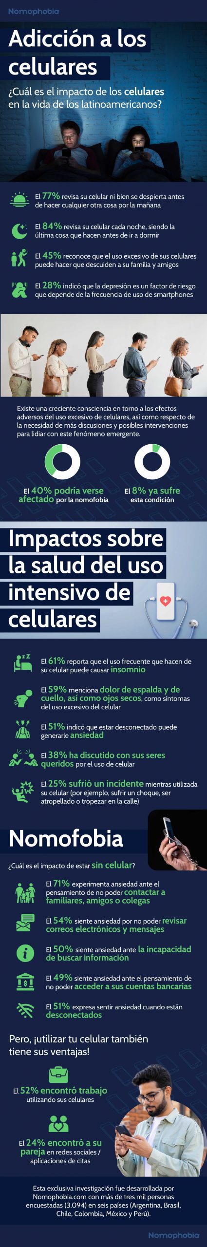 Nomofobia, término acuñado en 2008 y que proviene de la abreviatura del inglés “no mobile phone phobia”, describe el miedo a estar desconectado del móvil. El sitio web Nomophobia.com publicó los resultados de un reciente estudio realizado con más de 3 mil personas de Argentina, Brasil, Chile, Colombia, México y Perú que revela que el 78% de los latinoamericanos se considera dependiente de sus smartphones.