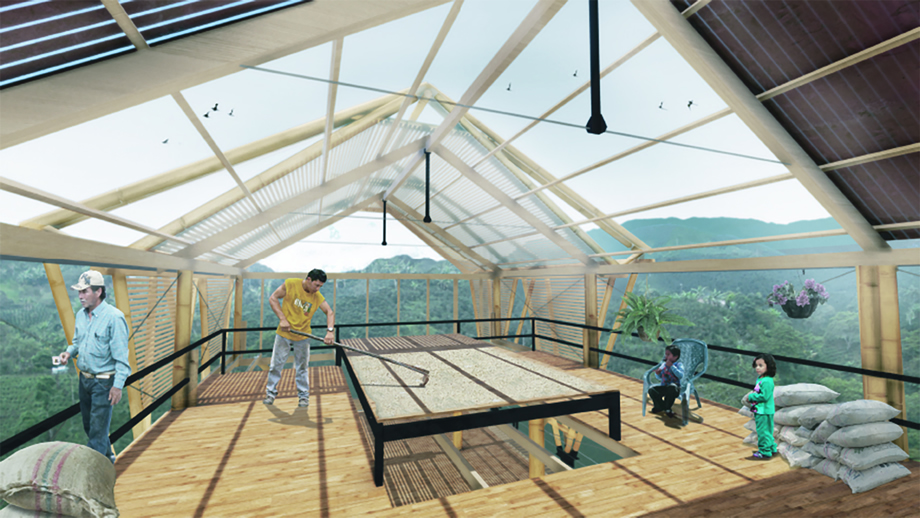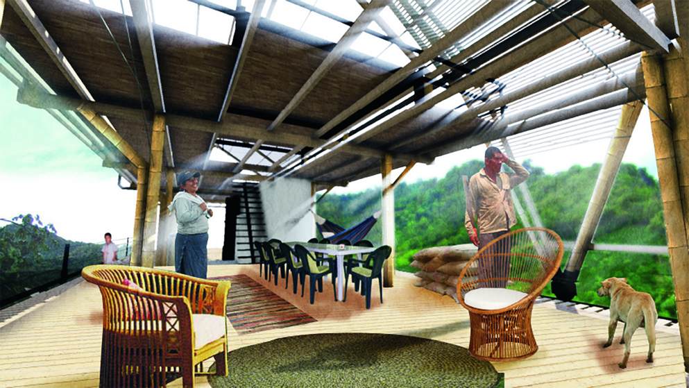 “Este proyecto se destaca por la claridad formal y constructiva, con un orden estructural que permite la adaptación de los espacios interiores a las necesidades de cada familia. El sistema estructural y constructivo está previsto para ser transportado con facilidad a los lugares de las viviendas e incorpora propuestas para el secado y tratamiento del café”. – Concepto del jurado
