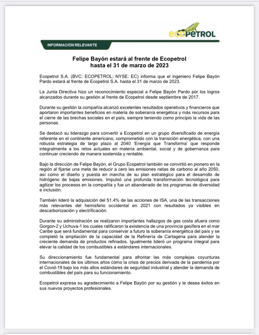 El presidente de #Ecopetrol, Felipe Bayón, anunció que dejará su cargo al frente de la empresa más importante del Estado el próximo 31 de marzo.