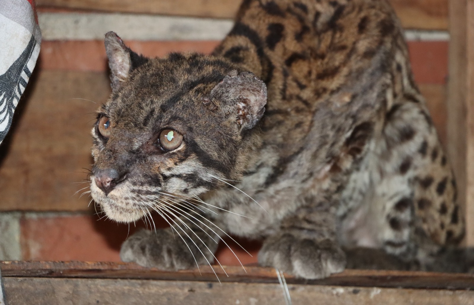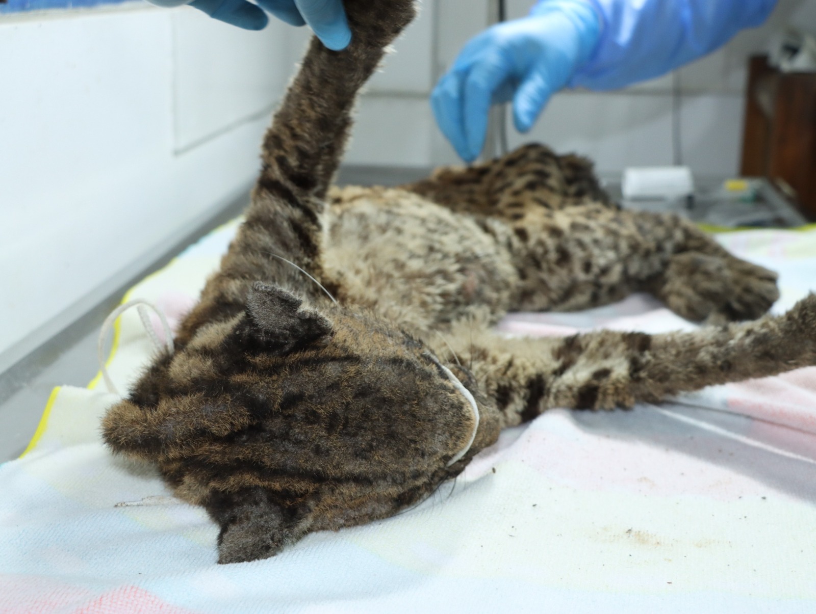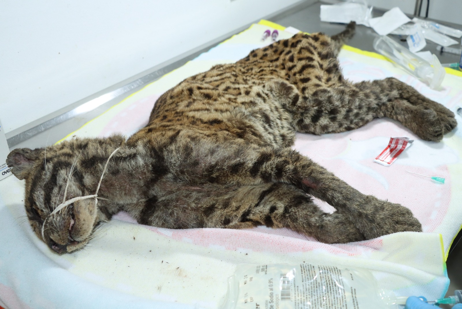 “La tigrilla llegó con deshidratación y desnutrición severa, problemas dermatológicos, secreción ocular, condición corporal baja, ausencia de dos colmillos”, explicó Edward Suárez, médico veterinario de la CAM.
