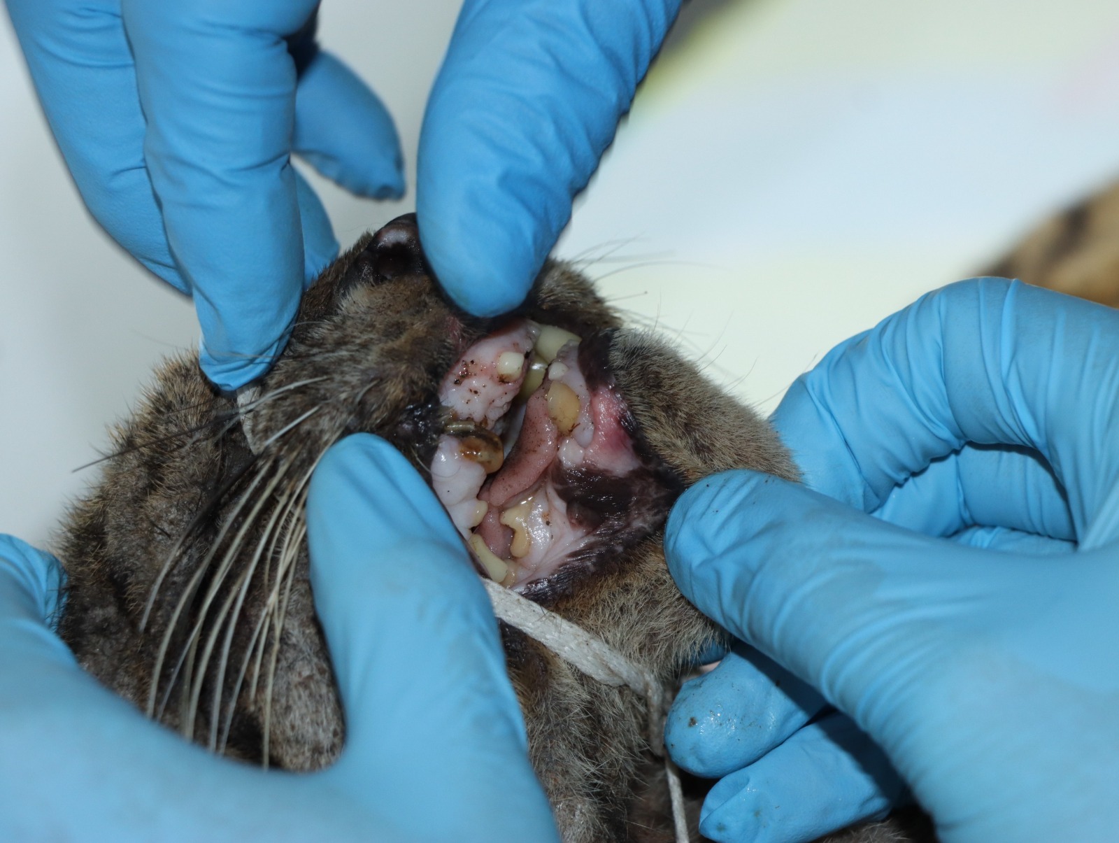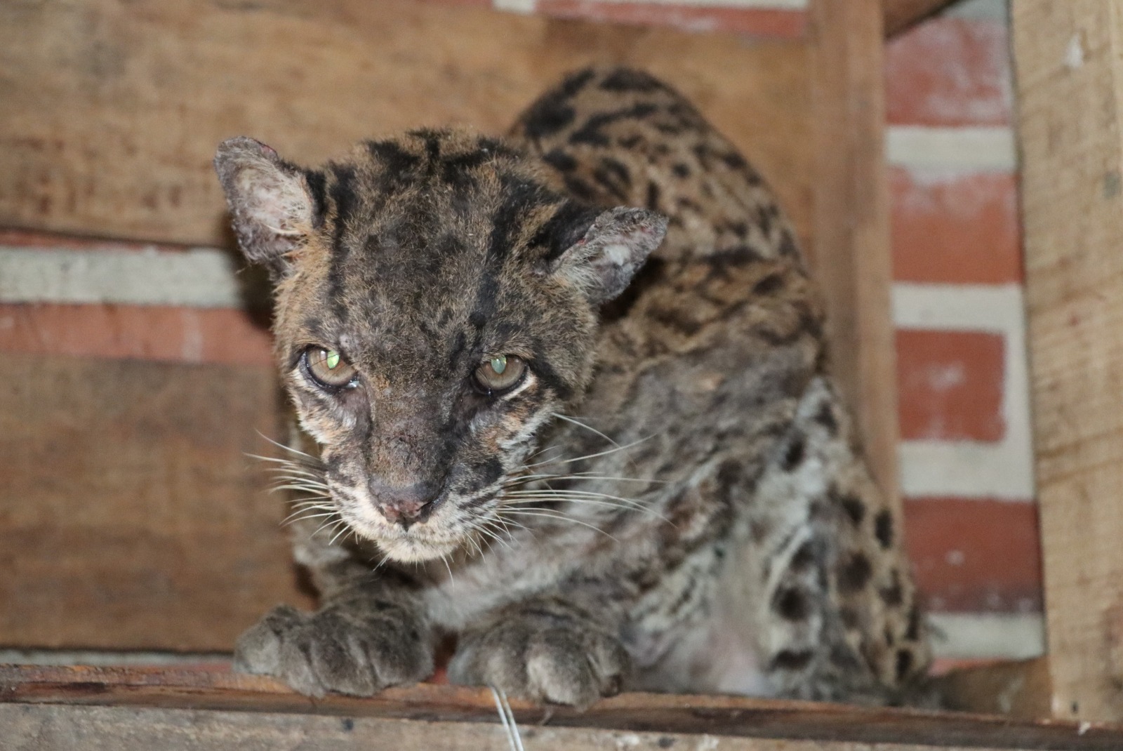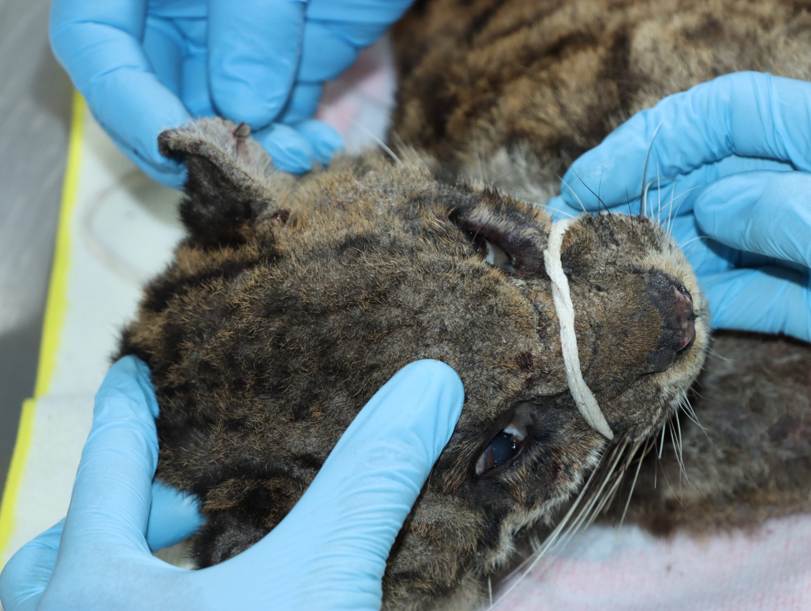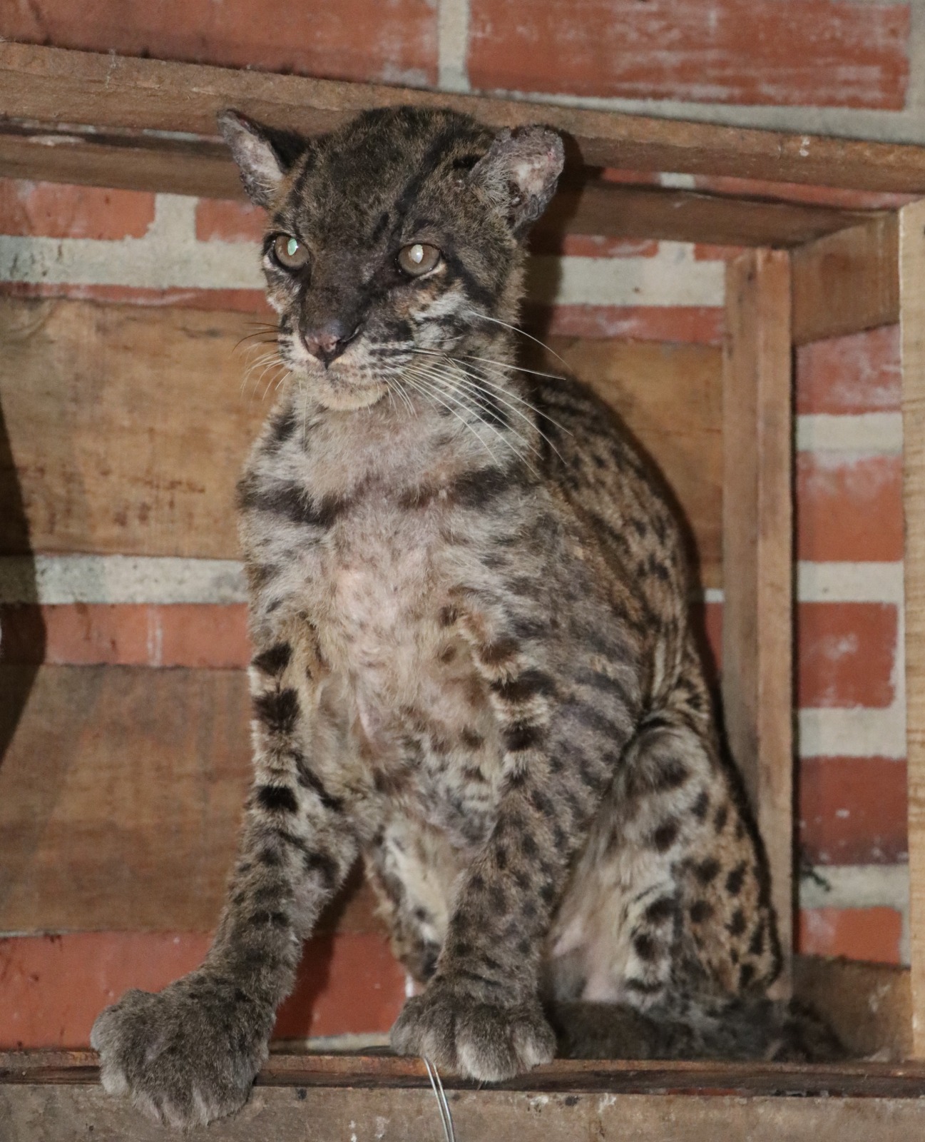 “La tigrilla llegó con deshidratación y desnutrición severa, problemas dermatológicos, secreción ocular, condición corporal baja, ausencia de dos colmillos”, explicó Edward Suárez, médico veterinario de la CAM.