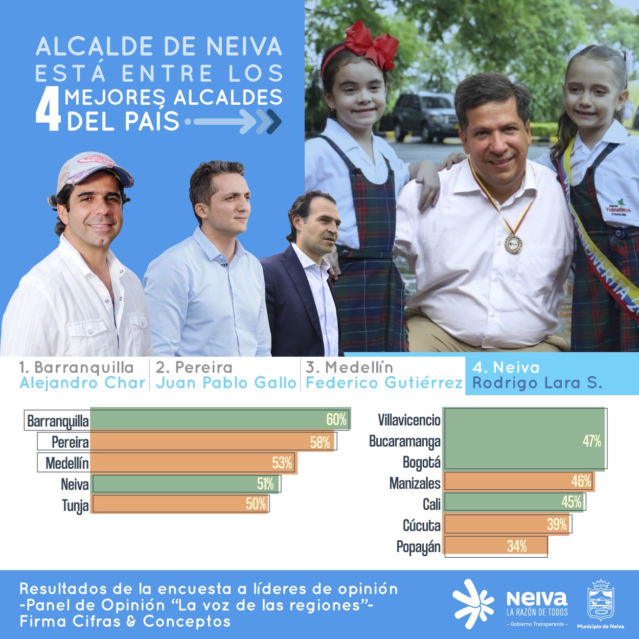 Junto a los mandatarios de Barranquilla, Pereira, Medellín y Tunja, el alcalde de Neiva entró en el ranking de los mejores alcaldes del país que realiza la firma encuestadora cifras y conceptos.