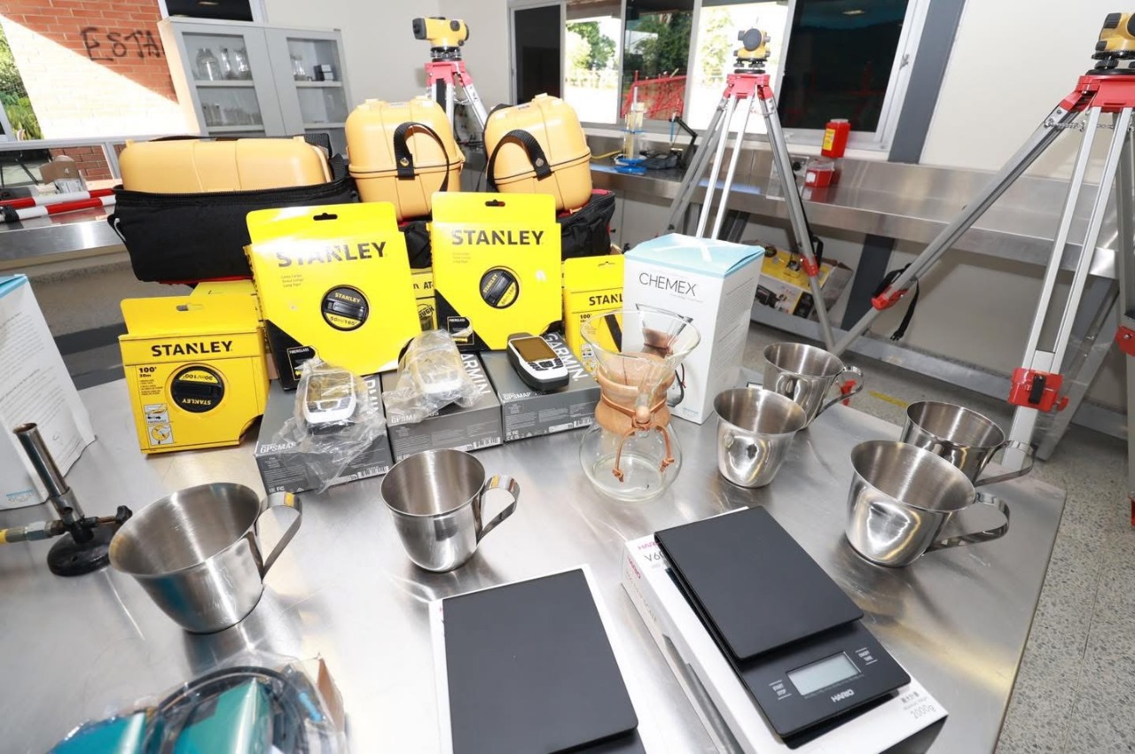 Por otro lado, docentes y estudiantes recibieron la nueva dotación del Laboratorio de Ciencias Básicas. En adelante contarán con elementos como: balanza de precisión portátil, colorímetro, contador PVD200, despulpadora de fruta, medidor de corriente universal, medidor de turbidez, medidor multiparámetro, secador de café para laboratorio y sensores de Humedad de Suelo, entre otros.
