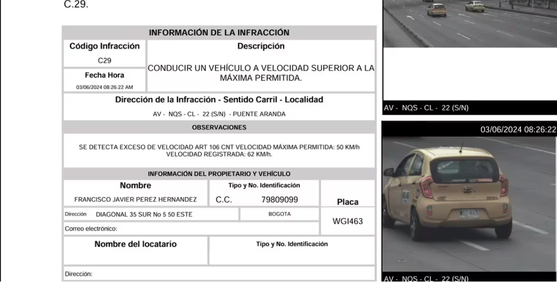 De acuerdo con la Secretaría de Movilidad de Bogotá, esta infracción fue cometida el 3 de junio de 2024 a las 8:26 a. m. en la Avenida NQS con calle 22, en sentido sur – norte. El vehículo está registrado bajo el nombre de Francisco Javier Pérez Hernández, aunque se desconoce si esta misma persona iba conduciendo el vehículo.