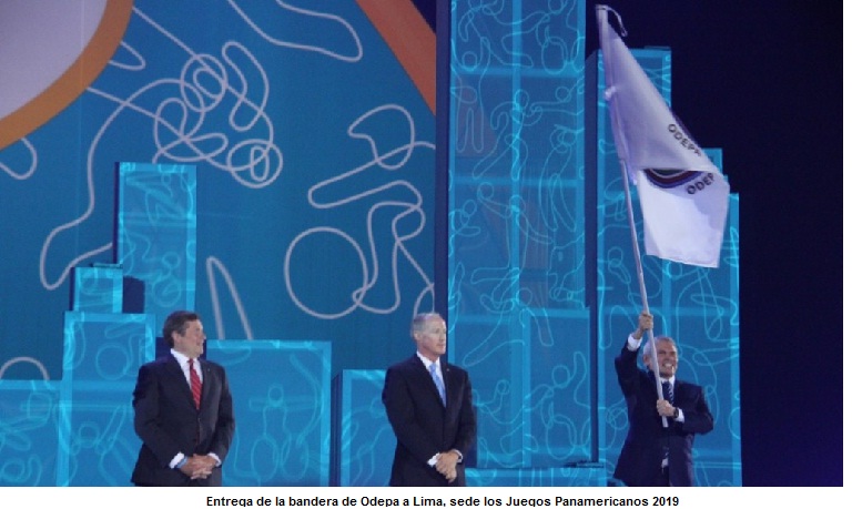 Además, la parte final de la ceremonia, que contó con la presencia de algunos atletas de las 41 delegaciones presentes, fue dedicada a la entrega de la bandera de la Organización Deportiva Panamericana a la delegación peruana procedente de Lima, ciudad que será la sede de la próxima celebración, en el año 2019.